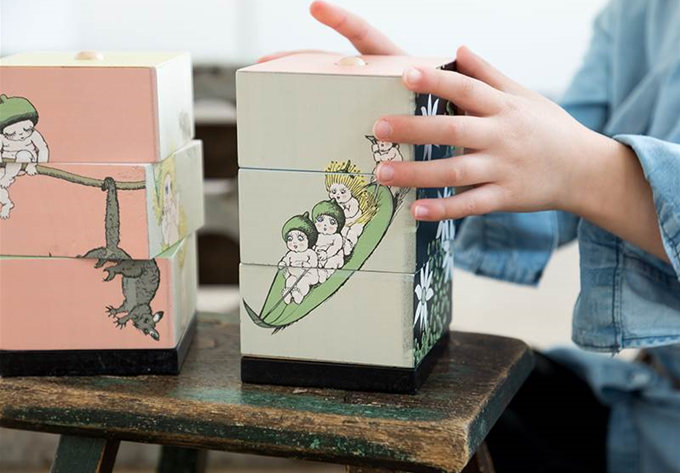 These twisty wooden blocks for tots sport a couple of Aussie treasures: Snugglepot and Cuddlepie.